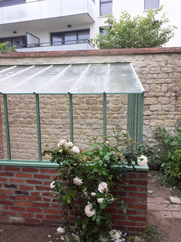 Les profils de cette serre sont en fer tés de 30x30mm et fer cornière de 30x20mm afin de restituer la finesse des verrières d'antan.